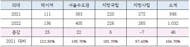 2022학년도에는 메이저의대를 포함한 서울 및 수도권에서 선발하는 의예과 인원이 전년도에 비해 47명이나 증가합니다.